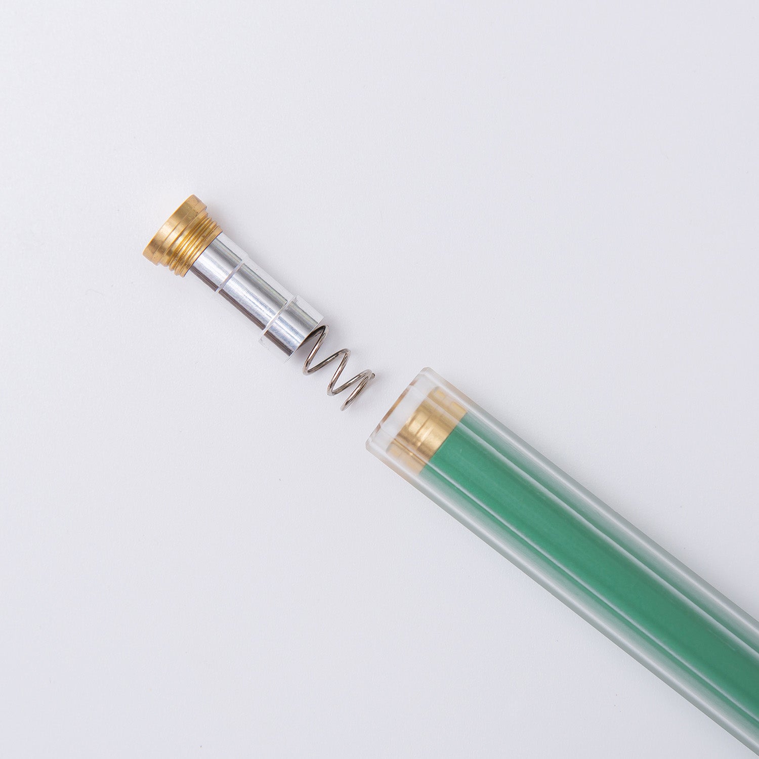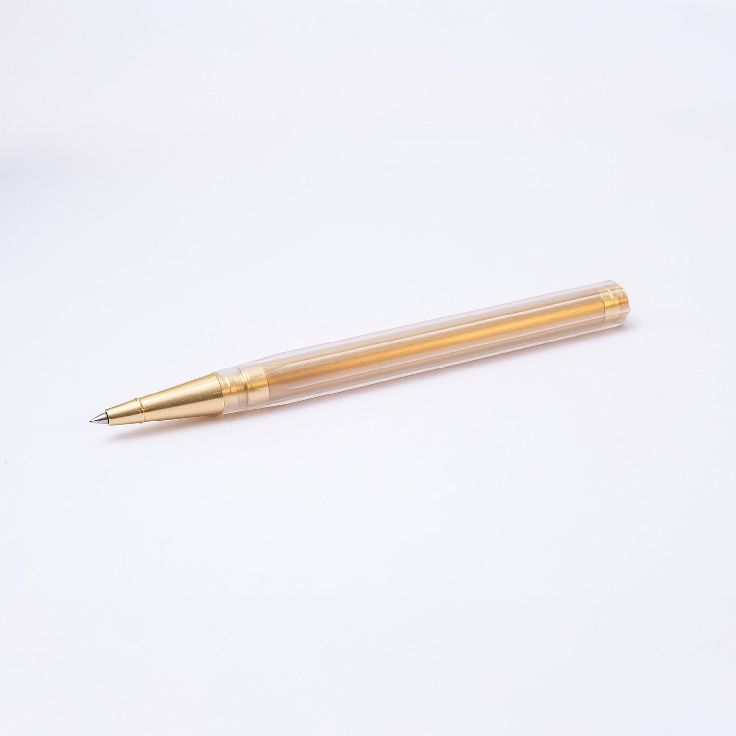• Its translucent design with a matte finish is available in three colors inspired by the landscapes of Taiwan: Clear Orange (twilight), Clear Green (morning fog) and Brass Gold (soft daylight) . With Ystudio 's signature precision and care, this pen merges honest materials with a functional design reminiscent of the feeling of holding your first pencil.